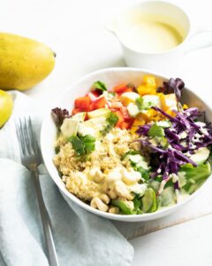 This tropical mango bowl with citrus drizzle combines quinoa, mixed greens, cashews, and mangos for a punch of flavor that we’re sure you’ll love!