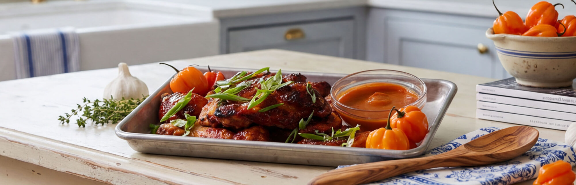 - Transfiere las alitas terminadas a una bandeja o fuente grande y decora con cebolla verde y cilantro si lo deseas.