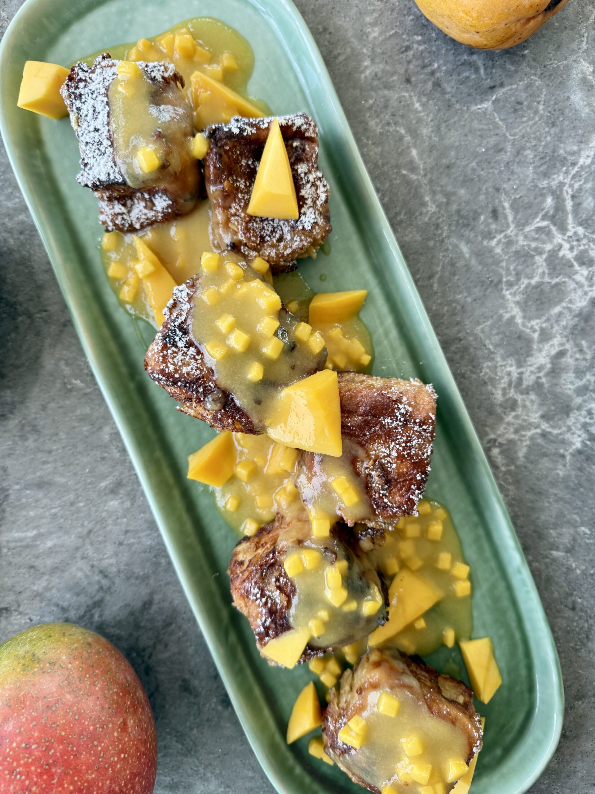 Pile the warm French toast bites high, drizzle with a little extra dipper if you like, and serve the rest on the side for dunking. Optional garnish: flaky salt or a dusting of powdered sugar.