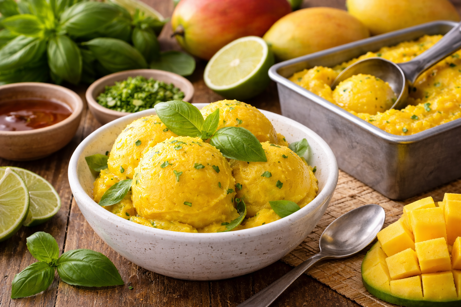 - In a blender, combine chopped mango, basil leaves, lime juice, agave syrup, water, and salt. Blend on high until completely smooth.